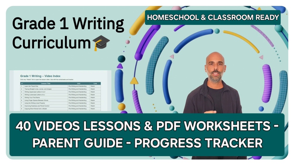 Get everything you need to teach First Grade writing at home — 40 video lessons, worksheets, and simple tools to keep your child on track.